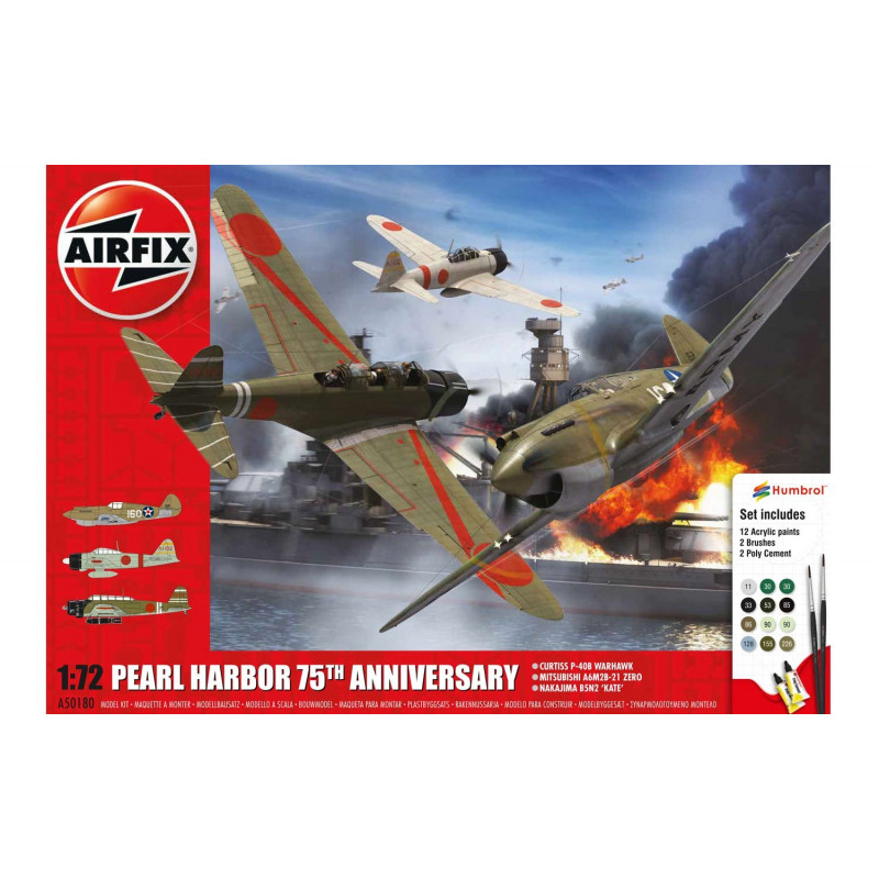Ce coffret maquette avion Airfix 1/72 a été édité pour le 75ème anniversaire de la bataille de Pearl Harbour. Il contient un Curtiss P-40B Warhawk, un Mitsubishi A6M28-21 Zéro et un Nakajima BSN2 "Kate" ainsi que 12 pots de peinture, de la colle et des pinceaux, réf: 50180