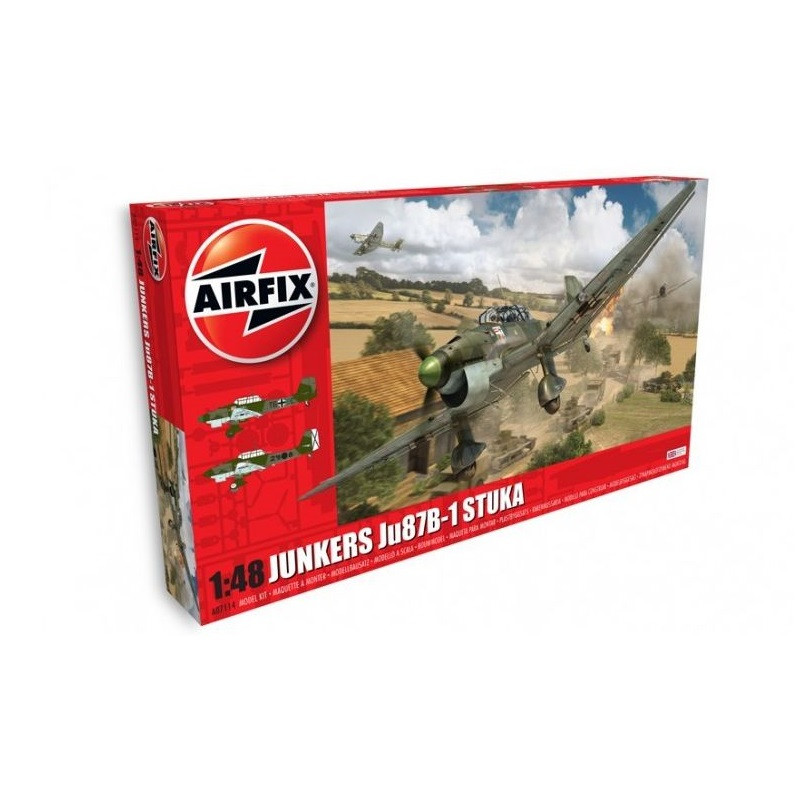 Le Junkers Ju 87 est le plus connu des bombardiers en piqué de la Luftwaffe employé durant la Seconde Guerre mondiale. La deuxième variante était le Ju 87B-1 qui fut produit en masse et majoritairement utilisé durant les premières campagnes allemandes de la guerre. La maquette avion Airfix au 1/48 reproduit ce légendaire aéroplane, réf: 07114