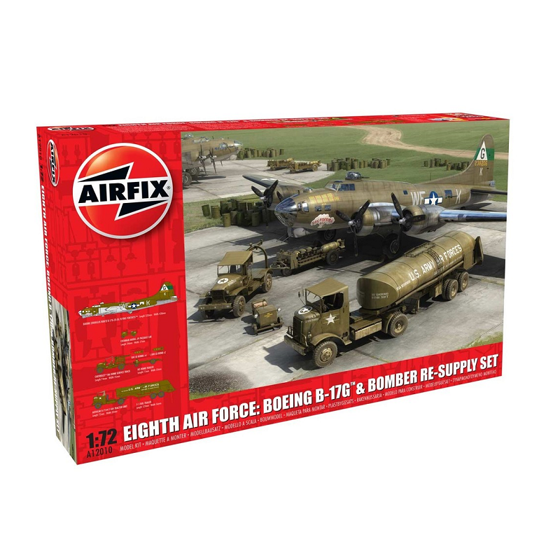 Ce coffret Airfix au 1/72 propose une maquette avion de Boeing B-17 G ainsi que tous les véhicules de ravitaillement (tracteur de piste Cushman, tracteur Chevrolet M6, remorque à bombes M5, tracteur autocar U-7144-T 4x4 et remorque à carburant F-1). Cet ensemble vous permettra de reproduire un diorama de la 8ème Air Force, réf: 12010