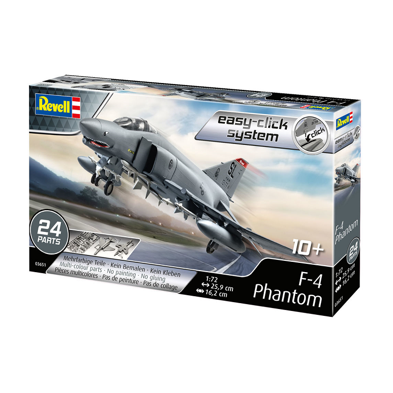 Le F-4 Phantom II est un avion militaire conçu par le constructeur américain McDonnell à partir de 1953. Il s'agit de l'un des avions militaires américains les plus importants du XXe siècle et l'avion de combat occidental ayant été le plus produit depuis la guerre de Corée. La maquette avion Revell au 1/72 est une version Easy-Click pré-peinte sans colle ni peinture, réf: 03651
