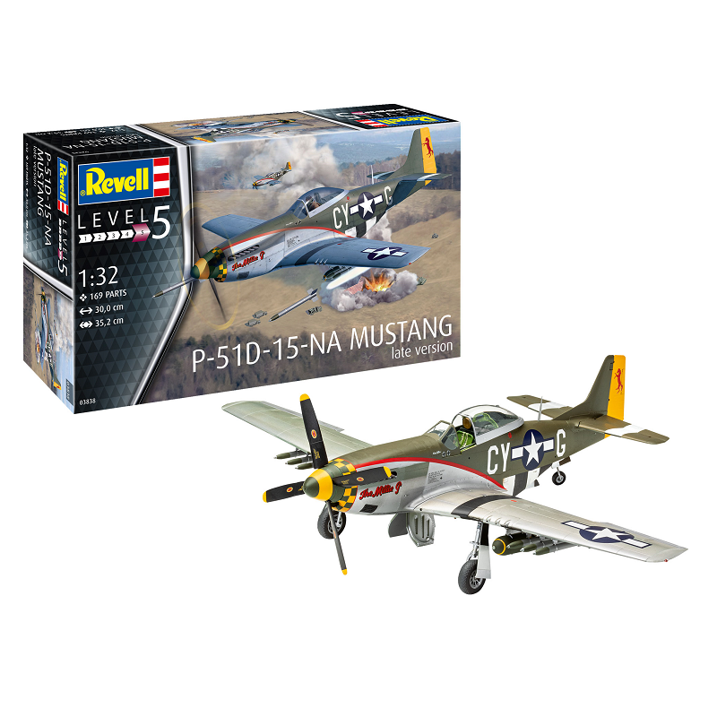 Le P-51 Mustang est un avion de chasse américain utilisé lors de la Seconde Guerre mondiale, il est au départ développé pendant l'année 1940 pour répondre au besoin urgent de chasseurs supplémentaires de la Royal Air Force. La maquette avion Revell au 1/32 propose la version de fin de production, réf: 03838
