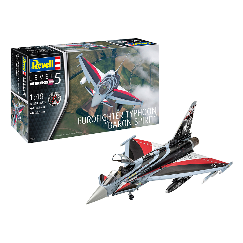 L'Eurofighter Typhoon est un avion de combat biréacteur, ailes delta et plan canard, multi-rôle, développé par le Royaume-Uni, l'Allemagne, l'Italie et l'Espagne regroupés dans le consortium Eurofightr GmbH, pays qui ont reçu leurs premiers appareils de série en 2004. La maquette avion Revell au 1/48 propose la version aux couleurs "Baron Spirit", réf: 03848
