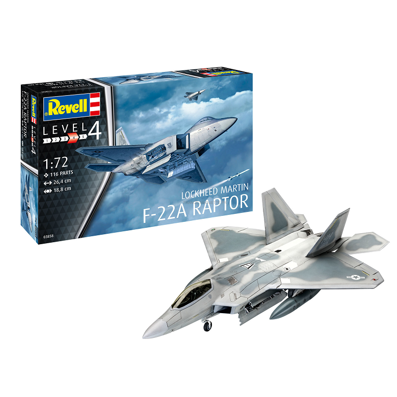 Le Lockheed Martin F-22 Raptor est un avion de chasse furtif développé par les Etats-Unis à la fin des années 1980 afin de remplacer les F-15 de l'US Air Force. La maquette avion Revell au 1/72 propose une reproduction de ce modèle, réf: 03858