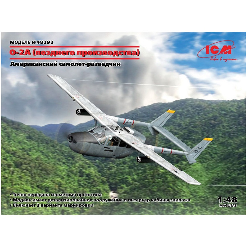 Le Cessna O-2 est un avion de reconnaissance bimoteur en tandem. C'est le remplaçant du Cessna O-1 Bird Dog et la version militaire du Cessna 337 Skymaster. Il servit lors de la guerre du Vietnam dans l'USAF ainsi que dans l'armée de l'air sud-vietnamienne jusqu'en 1975 La maquette avion ICM au 1/48 propose une reproduction de ce modèle, réf: 48292