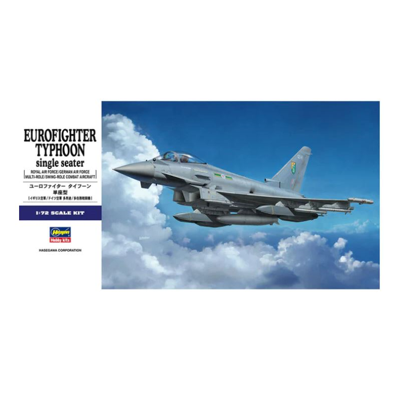 L'Eurofighter Typhoon est un avion de combat bi-réacteur, ailes delta et plan canard, multi-rôle, développé par le Royaume-Uni, l'Allemagne, l'Italie et l'Espagne regroupés dans le consortium Eurofighter GmbH, pays qui ont reçu leurs premiers appareils de série en 2004. La maquette avion Hasegawa au 1/72 propose une reproduction de ce modèle, réf : 01570
