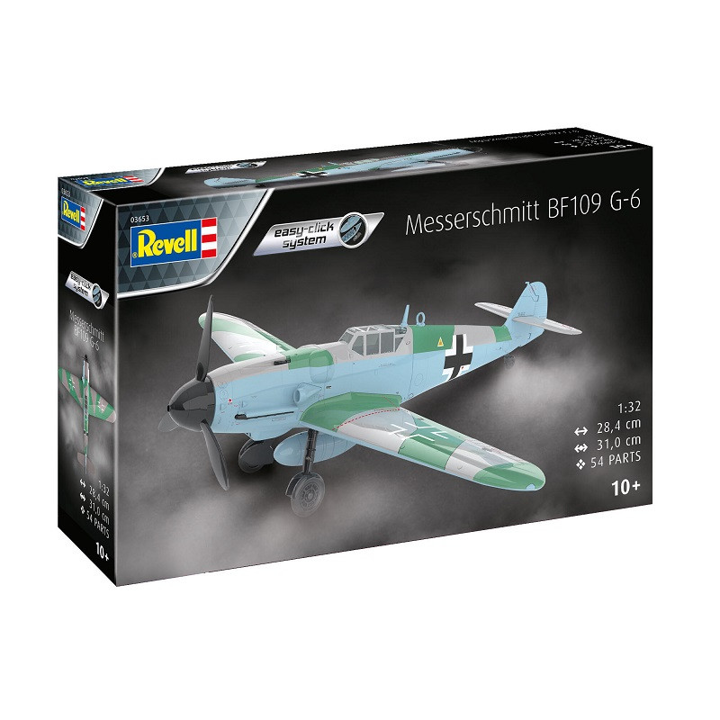 Le Messerschmitt Bf 109 est un chasseur monomoteur monoplace allemand conçu par l'ingénieur allemand Willy Messerschmitt en réponse à un appel d'offres du RLM pour la conception d'un chasseur moderne devant équiper la Luftwaffe naissante en 1935. La maquette avion Revell au 1/32 propose la version G en Easy-Click, réf: 03654