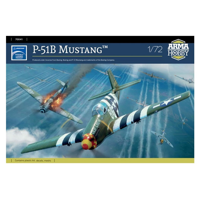 Le P-51 Mustang est un avion de chasse américain utilisé lors de la Seconde Guerre mondiale. Il est développé pendant l'année 1940 pour répondre au besoin urgent de chasseurs supplémentaires de la royal Air Force. La maquette avion Arma Hobby propose de reproduire ce modèle emblématique, réf: 70041