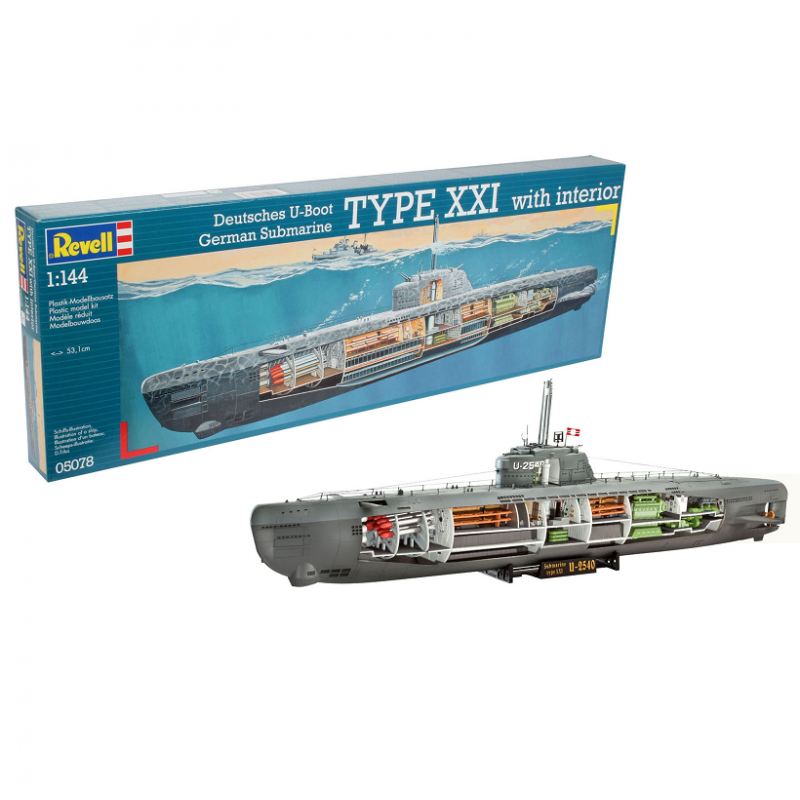 Le Type XXI est un sous-marin allemand de la Seconde Guerre Mondiale, révolutionnaire pour l'époque, capable d'atteindre la vitesse de 17,5 nuds en plongée et de parcourir plus de 220 nautiques sous l'eau à sa vitesse économique. La maquette bateau Revell au 1/144 propose une partie babord amovible laissant apparaitre l'intérieur du navire, réf: 05078