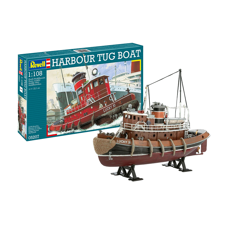 Les remorqueurs n'emportent aucune charge, ils servent seulement à touer et pousser les pétroliers et les cargos mors de leurs manoeuvres dans les ports. Il s'agit de bateaux robustes et très maniables, indispensables au bon fonctionnement des ports de marchandise. La maquette Revell au 1/108 contient des défenses latérales (en cordage tressé sur l'original) et trois figurines, réf: 05207