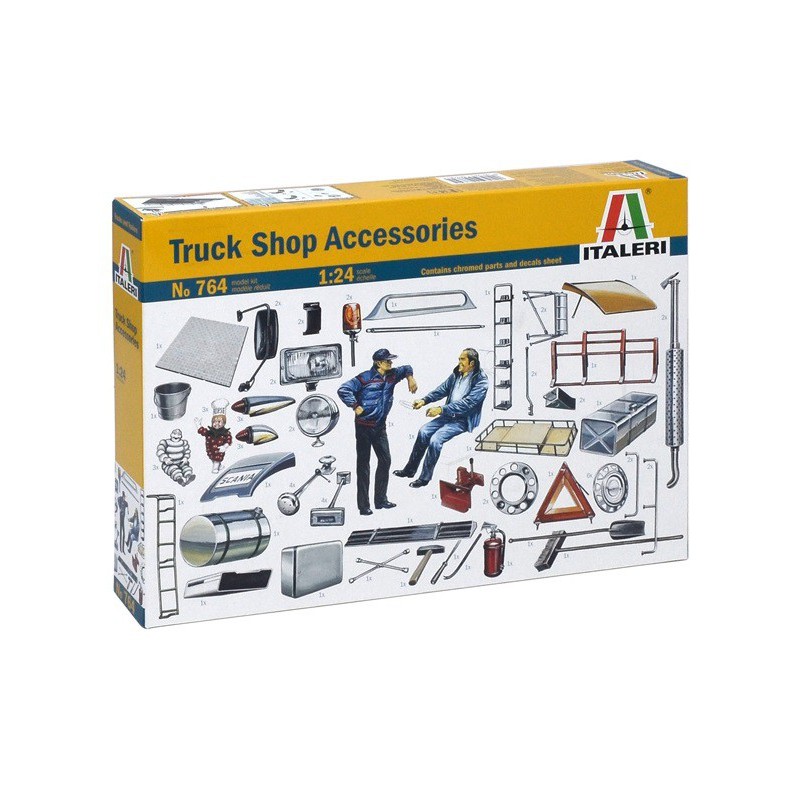 Boite daccessoires Italeri pour maquette camion 1/24 composée d'une plaque striée chromée, de phares, galerie de toit, pare-buffles, enjoliveurs, 2 figurines, diverses décalques... Il s'agit de la réédition d'une boite des années 80, réf 764