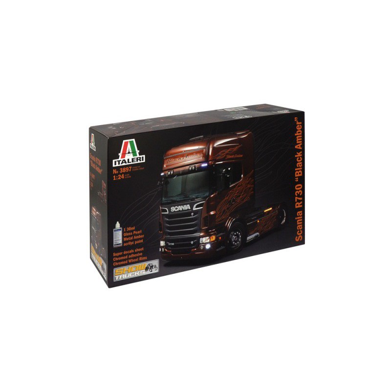 Le Scania R730 Topline est le modèle haut de gamme de la marque Scania. La version "Black Amber" est une série limitée et numérotée, réalisée par le célèbre carrossier Swempas. La maquette camion Italeri au 1/24 reproduit ce modèle et propose une planche de stickers chromés, la décoration spécifique en décalques et un flacon de la peinture originale acrylique, réf : 3897