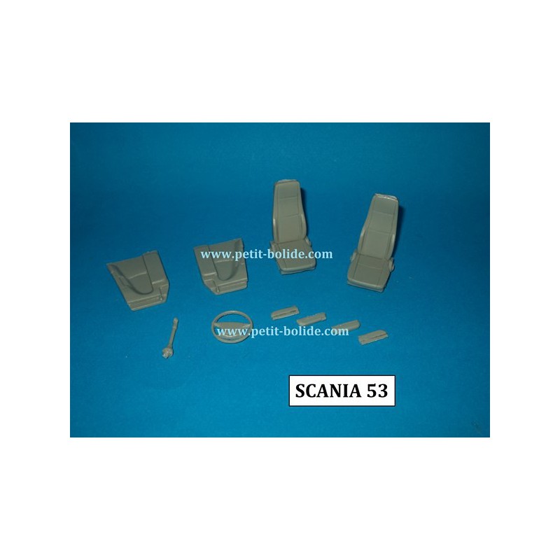 Set d'accessoires en résine pour agrémenter vos cabines de maquettes Scania au 1/24. Il se compose de sièges, accoudoirs, contre-portes, volant, levier de vitesse