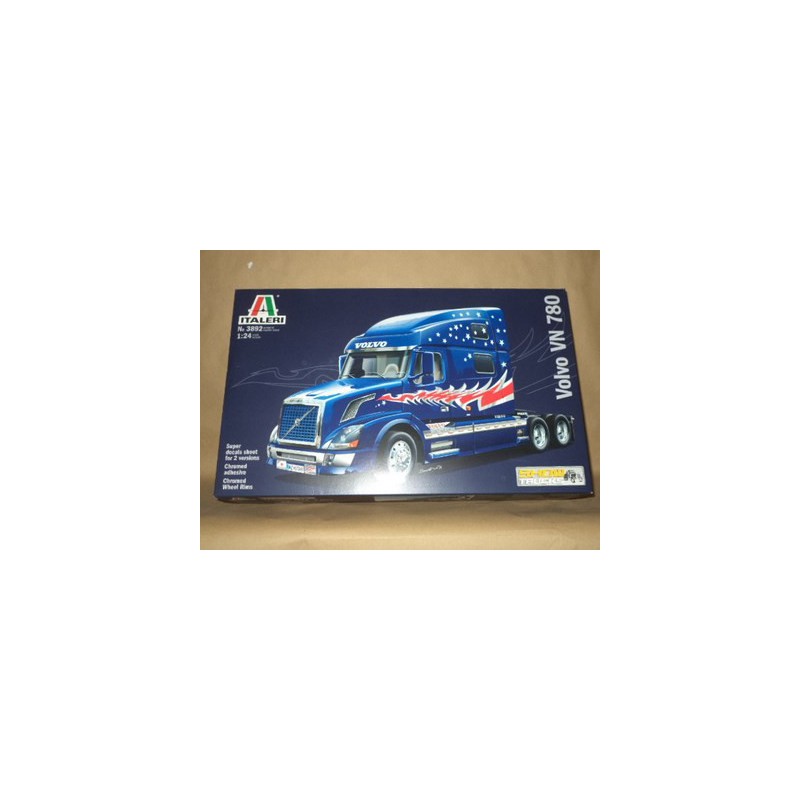 Le tracteur Volvo VN 780 a été développé pour répondre aux exigences du marché américain. La cabine est spacieuse et très confortable, elle est adaptée aux longs parcours dans les grands espaces. La maquette camion Italeri au 1/24 propose des décalques pour 2 versions et des stickers chromés, réf: 3892