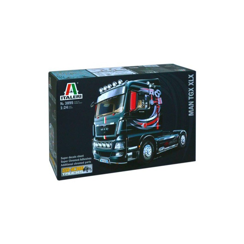 Nouvelle génération du tracteur Man, le TGX propose une aérodynamique alliant rafinement et économie de carburant, la version XLX correspond à une toiture de hauteur intermédiaire. La maquette Italeri au 1/24 propose la version customisée "Show Truck" du MAN TGX avec de nombreuses pièces chromées (jantes, rampe de toit, phares, protections latérales, trompes de klaxon...) et stickers chromés (calandre, joncs de carrosserie, panneaux latéraux, trappes...), réf : 3895