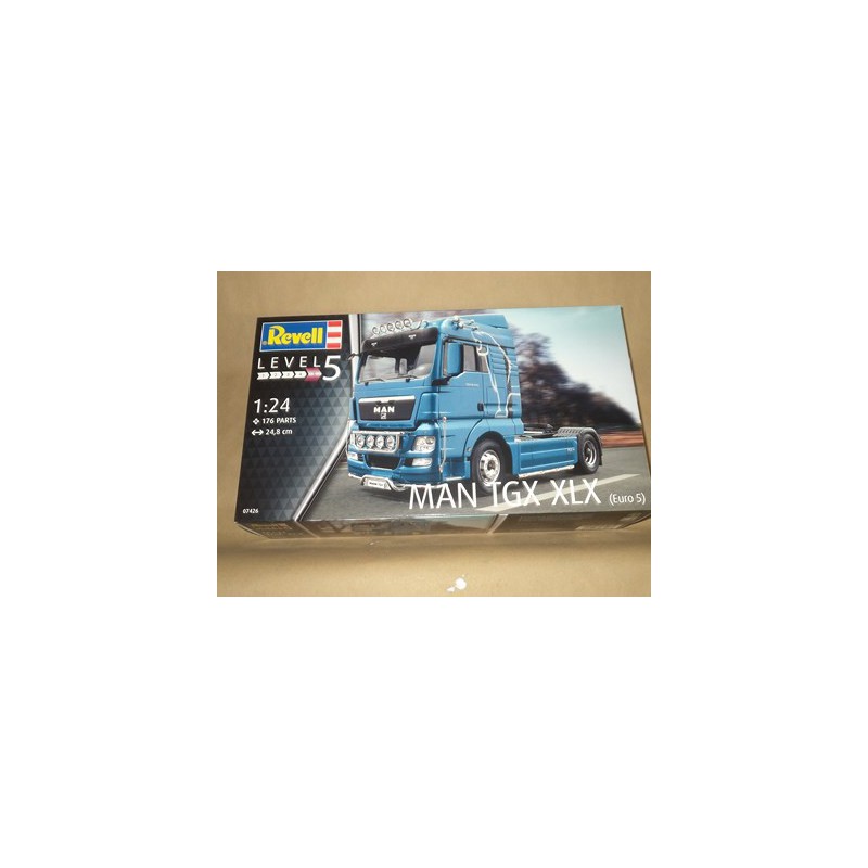 Nouvelle génération du tracteur Man, le TGX propose une aérodynamique alliant rafinement et économie de carburant, la version XLX correspond à une toiture de hauteur intermédiaire. La maquette Revell au 1/24 propose de nombreuses pièces chromées (jantes, rampe de toit, phares, protections latérales, trompes de klaxon...), réf : 07426