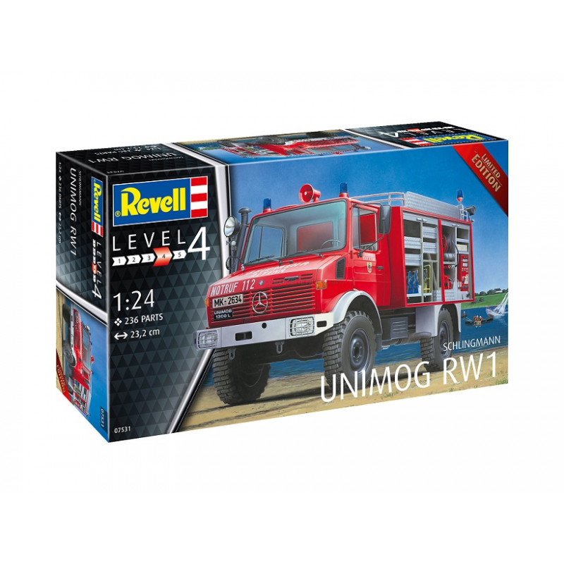 Le Mercedes Unimog est un engin de franchissement utilisé dans divers secteurs d'activité. Il est notamment utilisé par les pompiers, leur permettant d'acheminer beaucoup de matériel dans des lieux peu accessibles. La maquette camion Revell au 1/24 propose une version KW1 accompagnée de nombreux accessoires, réf: 07531