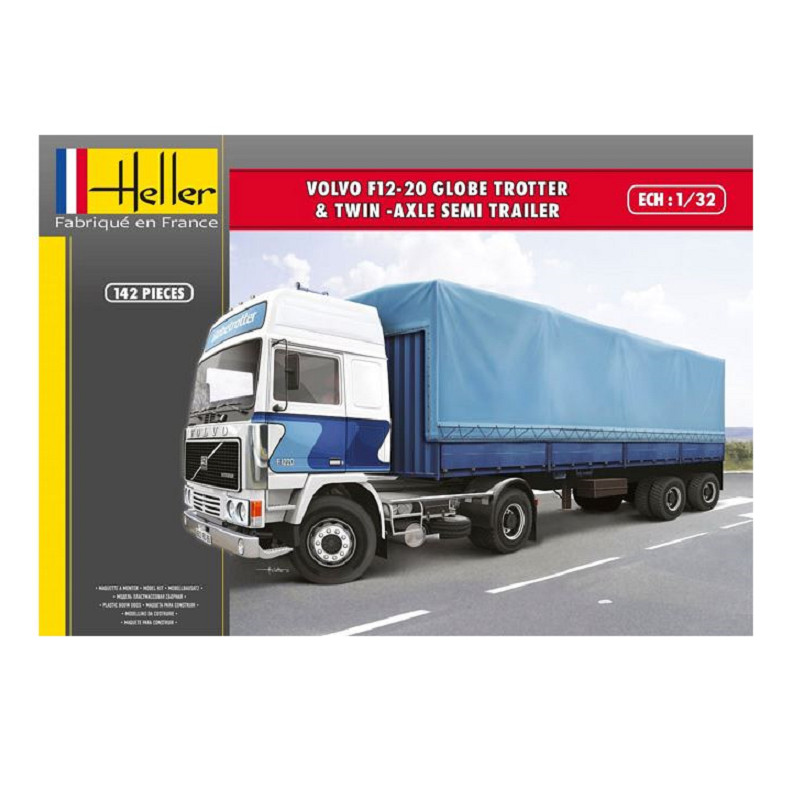 Cette maquette Heller au 1/32 propose la reproduction d'un tracteur Volvo F12-20 Globetrotter et d'une remorque savoyarde deux essieux, réf : 81703