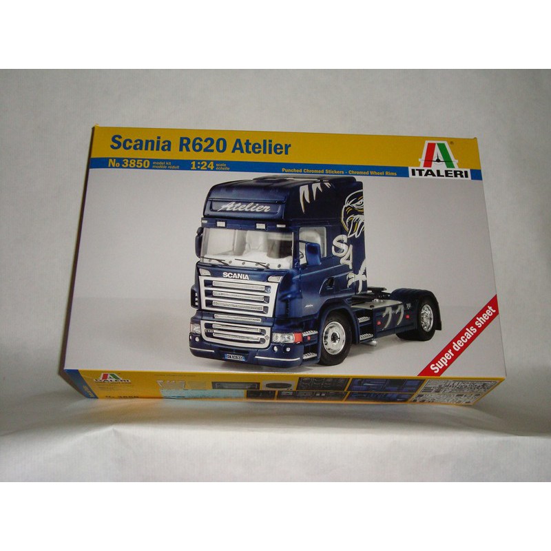 Le Scania R620 "Atelier" est un tracteur de la marque préparé par la firme italienne Atelier. La maquette camion Italeri au 1/24 comprend une superbe décoration représentant le griffon, emblème de la marque Scania, ainsi que des jantes chromées et des autocollants permettant de réaliser la calandre chromée de cette version, réf: 3850