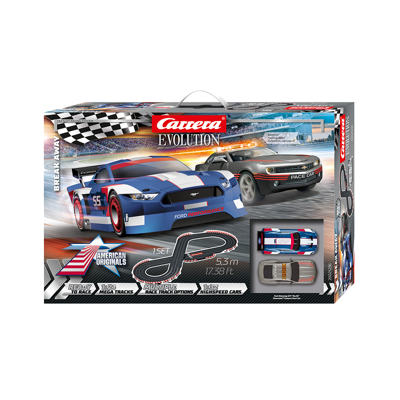 Ce circuit Carrera Evolution propose deux voitures américaine : une Chevrolet Camaro Pace Car et une Ford Mustang GTY. Il s'agit d'un circuit analogique de 5.3 mètres de développé et d'un encombrement de 139 x 217cm. Le coffret contient le circuit, les deux voitures à l'échelle 1/32 et deux poignées. Le circuit accepte également les voitures au 1/24 et peut évoluer grâce aux kits d'extension ou être digitalisé grâce à des décodeurs. A partir de 8 ans, réf : 20025236