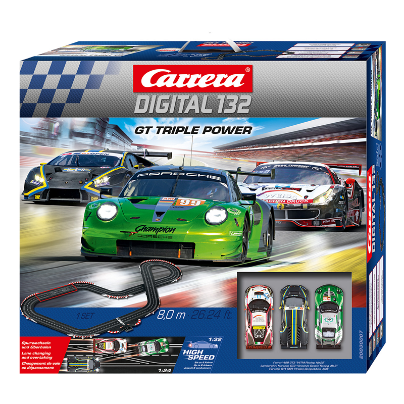 Ce circuit Carrera Digital propose trois voitures : une Lamborghini Huracan GT3, une Ferrari 488 GT3 et une Porsche 911 RSR. Il s'agit d'un circuit digital de 8 mètres de développé et d'un encombrement de 152 x 321cm. Le coffret contient le circuit dont un changement de voies, les trois voitures à l'échelle 1/32 et trois poignées. Le circuit accepte également les voitures au 1/24 et peut évoluer grâce aux kits d'extension. La technologie digitale permet de jouer seul en faisant rouler d'autres voitures et jusqu'à 6 joueurs. A partir de 8 ans, réf : 20030007