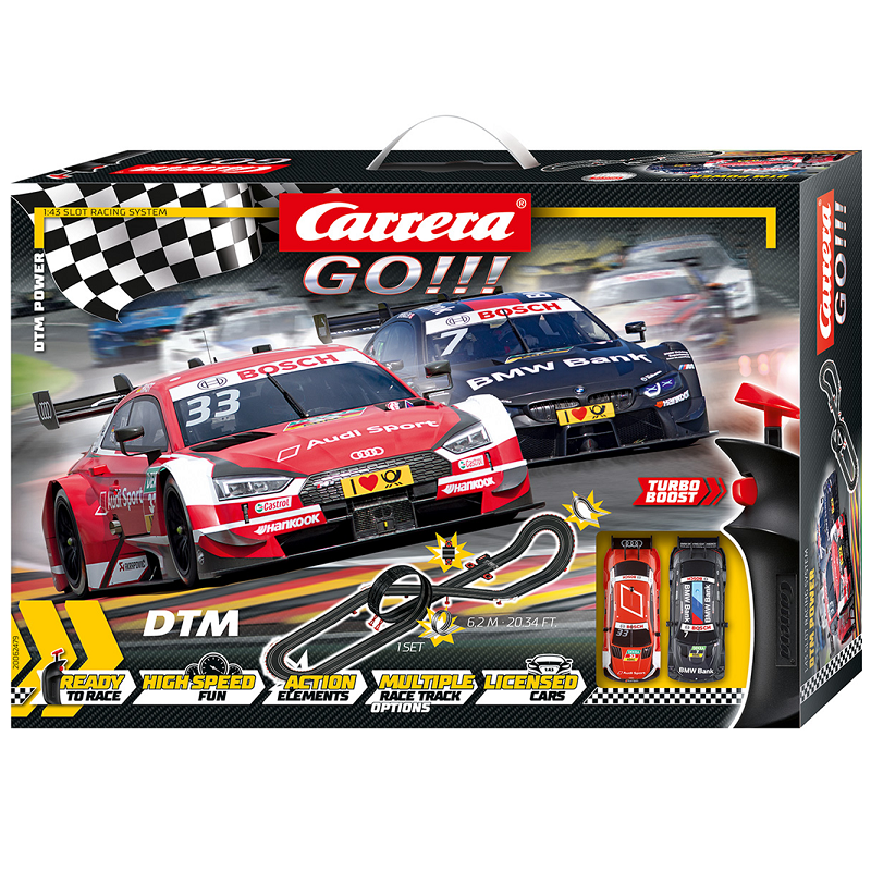 Ce circuit Carrera GO propose deux voitures : une BMW M4 DTM et une Audi RS 5. Il s'agit d'un circuit analogique de 6.2 mètres de développé et d'un encombrement de 68 x 234cm. Le coffret contient le circuit avec un looping et un virage relevé, les deux voitures à l'échelle 1/43, deux poignées et un compte-tours. Le circuit peut évoluer grâce aux kits d'extension. A partir de 6 ans, réf : 20062479