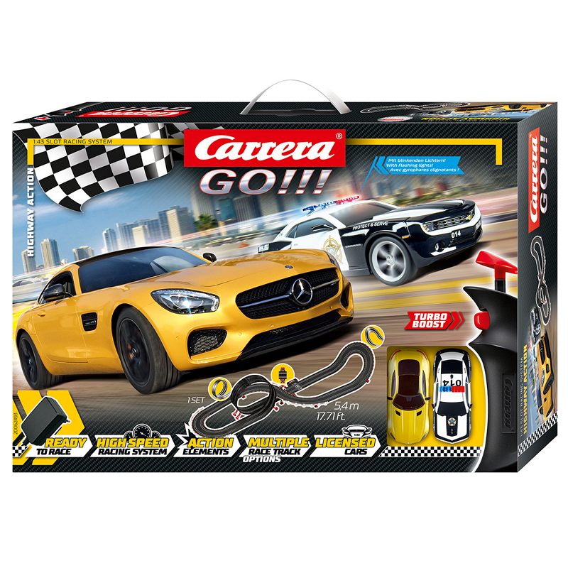 Ce circuit Carrera GO propose deux voitures : une Chevrolet Camaro 2015 "Sheriff" et une Mercedes-AMG Gt. Il s'agit d'un circuit analogique de 5.4 mètres de développé et d'un encombrement de 60 x 192cm. Le coffret contient le circuit avec un looping et un virage relevé, les deux voitures à l'échelle 1/43, deux poignées et un compte-tours. Le circuit peut évoluer grâce aux kits d'extension. A partir de 6 ans, réf : 20062493