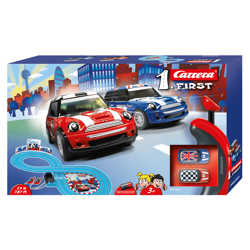 Ce circuit Carrera First propose deux Mini Cooper. Il s'agit d'un circuit de 2.4 mètres de développé et d'un encombrement de 45 x 93cm. Ce coffret contient un circuit adapté aux enfants à partir de 3 ans, réf : 20063009