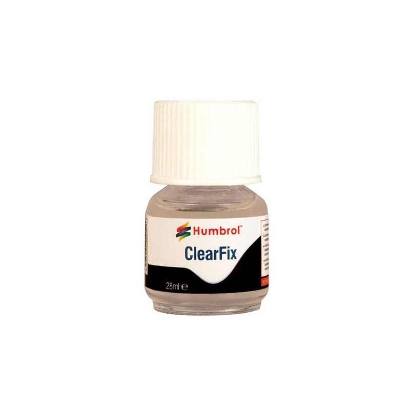 Cette colle Clearfix est fabriquée par Revell, réf: AC5708. Elle permet de réaliser les collages des pièces transparents type vitres sans créer d'opacité. Présentée en flacon de 28 ml, elle s'applique au pinceau fixé au bouchon.