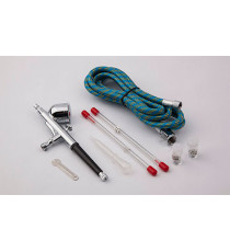 Ce coffret contient un aérographe double action par gravitation, vous contrôlez à la gâchette le débit d'air et le débit de la peinture.