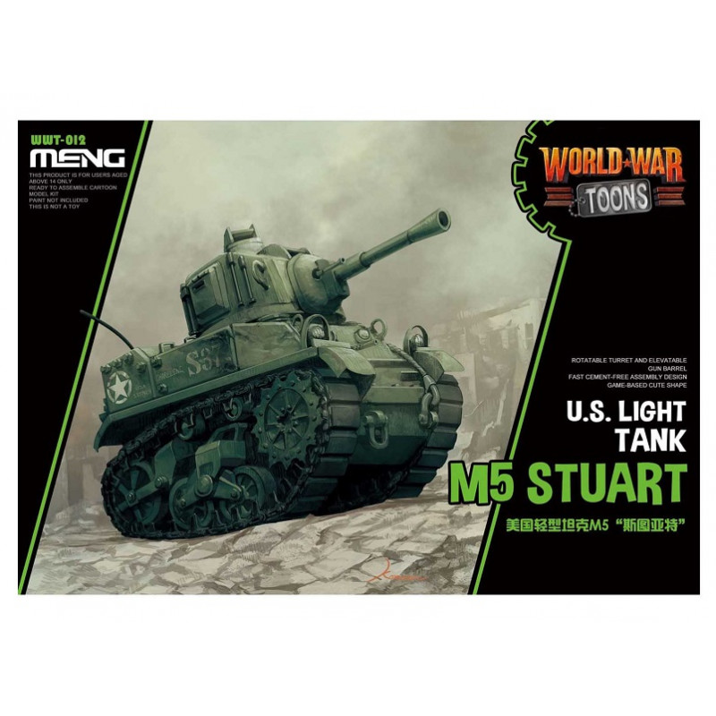 Le M5 est un char léger produit par les Etats-Unis au cours de la Seconde Guerre mondiale, il doit son surnom "Stuart" aux britanniques qui l'ont également utilisé. Cette maquette enfant Meng n’a pas d’échelle précise. Il s’agit d’une maquette simplifiée destinée aux enfants et ne nécessite ni peinture ni colle, réf: WWT-012
