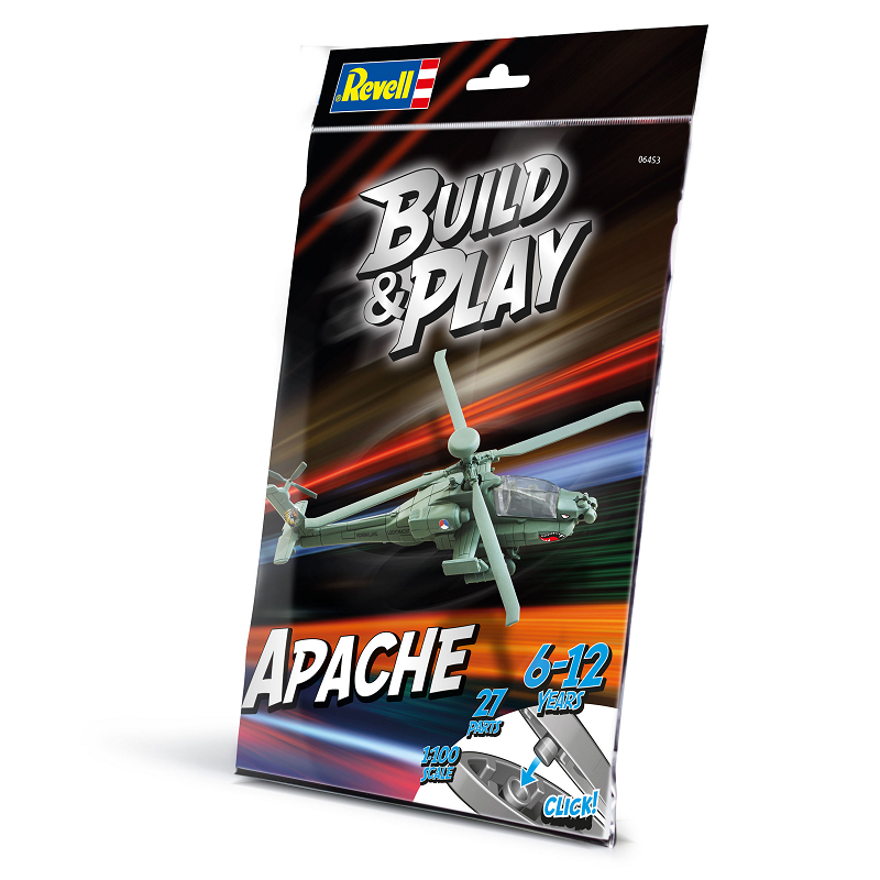 L’AH-64 Apache est un hélicoptère d'attaque tous temps. La maquette Revell au 1/100 est un easykit, il ne nécessite ni collage, ni peinture, les pièces s'emboitent, à partir de 6 ans, réf: 06453