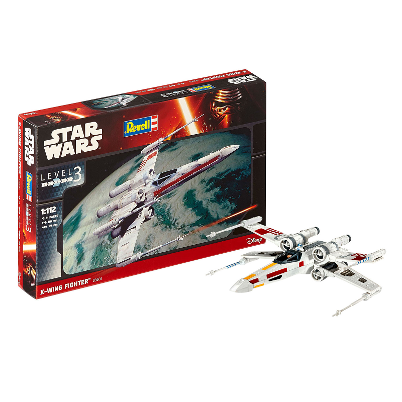 Le T-65 X-wing Fighter doit son nom aux doubles ailes superposées qui forment un X. En plus de quatre canons laser à haute énergie le Fighter X-wing possède des torpilles à protons et un déflecteur de boucliers. Luke Skywalker préfère ce type d'appareil. Il a été utilisé par le jeune Jedi pour détruire l'Etoile de la Mort lors de la première bataille de Yavin. La maquette Revell au 1/112, à peindre et à coller, mesure 99 x 110 mm, réf 03601