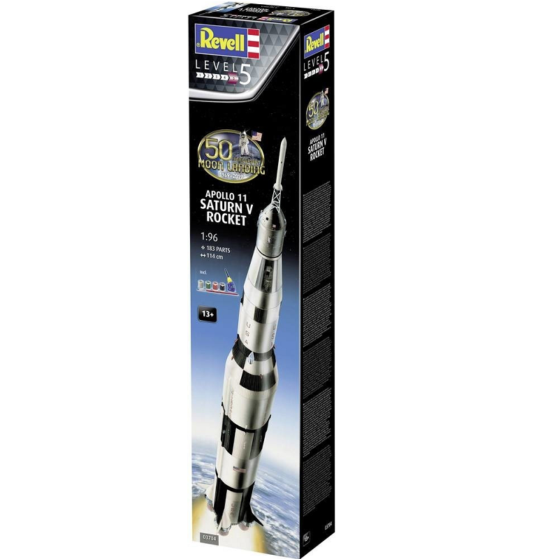 Le 16 juillet 1969, à 9h32, le gigantesque Saturne V est lancé de Cap Canaveral pour le voyage le plus important de l'histoire de l'humanité. L'immense Saturn V se composait de trois modules principaux, mesurait 110 m de haut et pesait 3 000 tonnes. Il pouvait transporter une charge utile de 50 t et atteindre la vitesse de 11,2 km/seconde. Le voyage de 394 000 km jusqu'à la lune a duré 72 heures. Après avoir atteint une orbite terrestre basse, l'ensemble supérieur avec la capsule Apollo a reçu la poussée du troisième étage du lanceur pour atteindre la vitesse de vol vers la Lune. Ensuite, l'ensemble Apollo s'est détaché de la fusée, a tourné et a sorti le module lunaire de son boîtier protecteur. Cet appareil a atteint la lune et s'est mis sur une orbite lunaire. Le module lunaire s'est ensuite séparé de la capsule de commandement avec les astronautes N. Armstrong et E. Aldrin à bord. Il ne restait que l'astronaute M. Collins dans la capsule de commandement. La maquette Revell au 1/96 propose une reproduction du lanceur mesurant 1,14 mètre. Il s'agit d'une réédition pour les 50 ans de la mission Apollo 11 qui contient colle, peintures et pinceau, réf: 03704