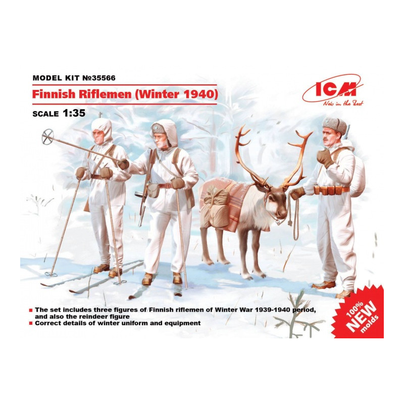 Cette boite maquette militaire ICM au 1/35 propose trois figurines représentant des soldats en tenue hivernale à l'hiver 1940 accompagnés dune figurine de renne, réf : 35566