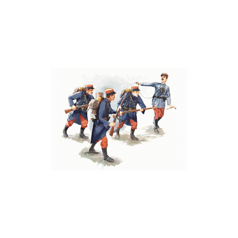 Cette boite maquette militaire ICM au 1/35 propose quatre figurines d'infanterie française de la Première Guerre Mondiale (1914), réf : 35682