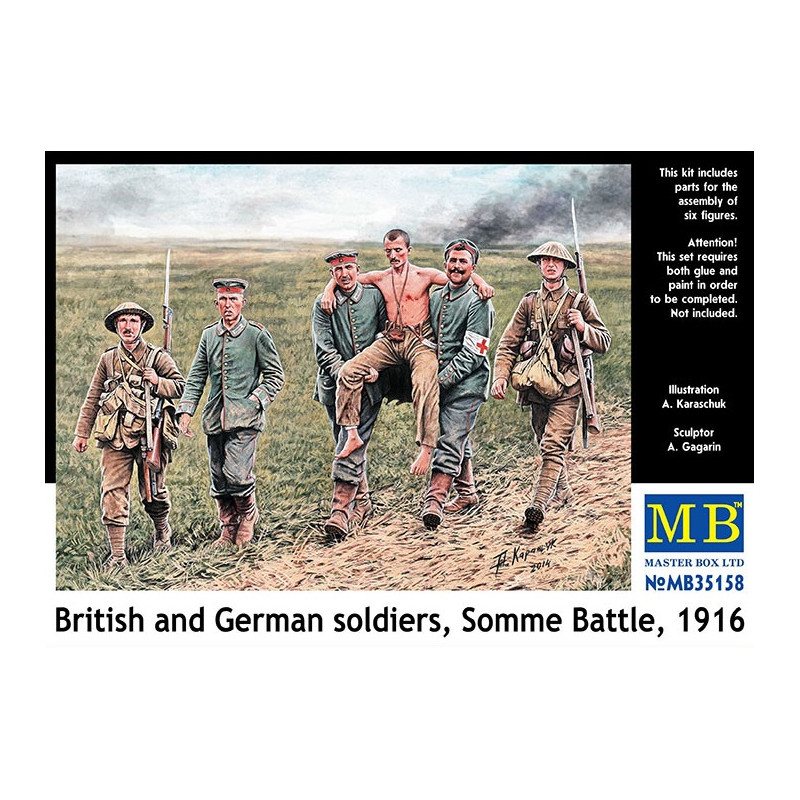 Cette boite maquette militaire MB au 1/35 propose six figurines 2 soldats britanniques, 3 soldats allemands prisonniers et un homme blessé au cours de la Bataille de la Somme en 1916, réf : 35158