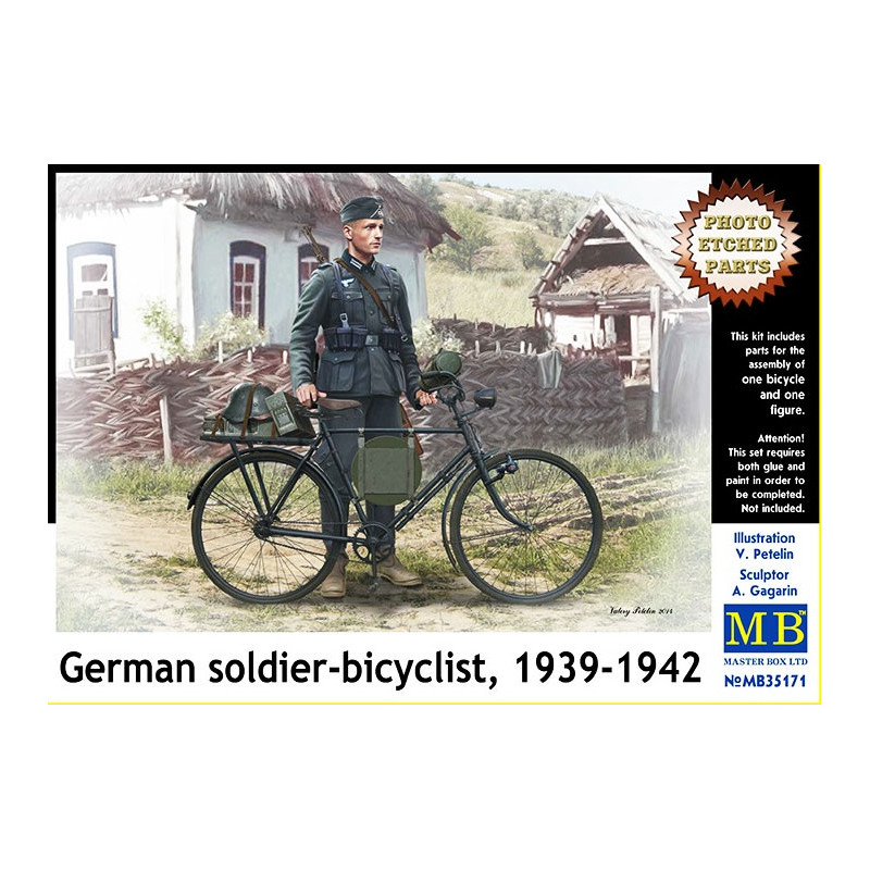 Cette boite maquette militaire MB au 1/35 propose une figurine de soldat allemand et une bicyclette, le kit contient des pièces en photo-découpe, réf : 35171