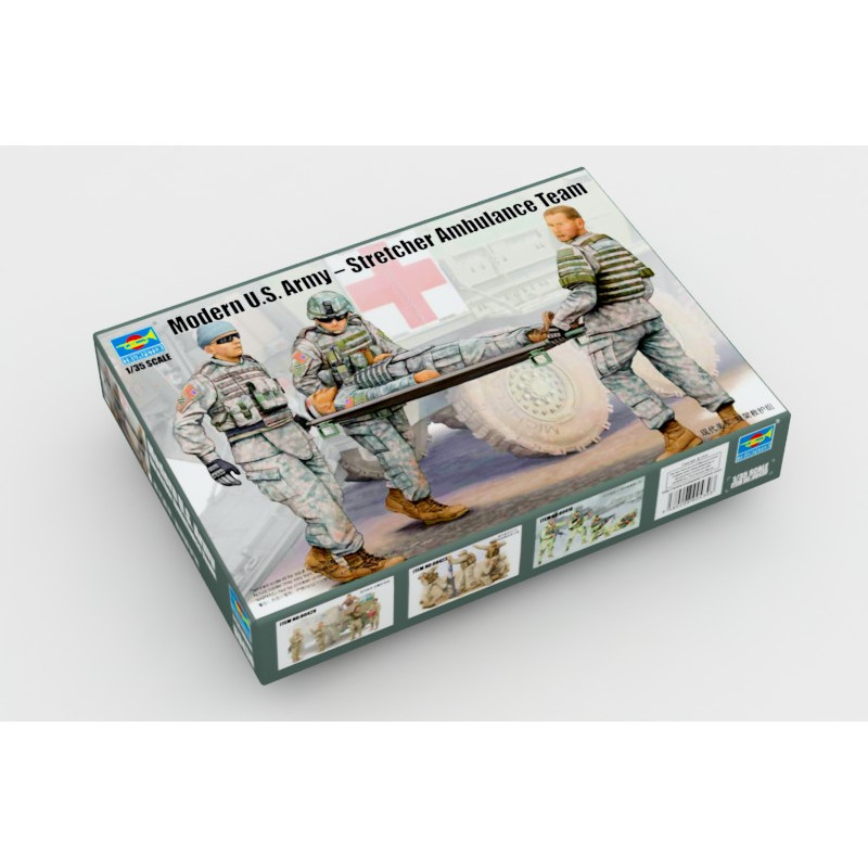 Cette boite Trumpeter au 1/35 contient 4 figurines à peindre dont un blessé sur une civière représentant une équipe médicale de l'armée américaine moderne, réf: 00430