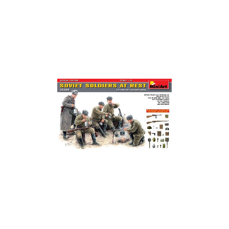 Cette boite maquette militaire Miniart au 1/35 propose 5 figurines de soldats russes au repos avec leurs accessoires au cours de la Seconde Guerre Mondiale. Elle permet d'agrémenter une seynette, réf : 35109
