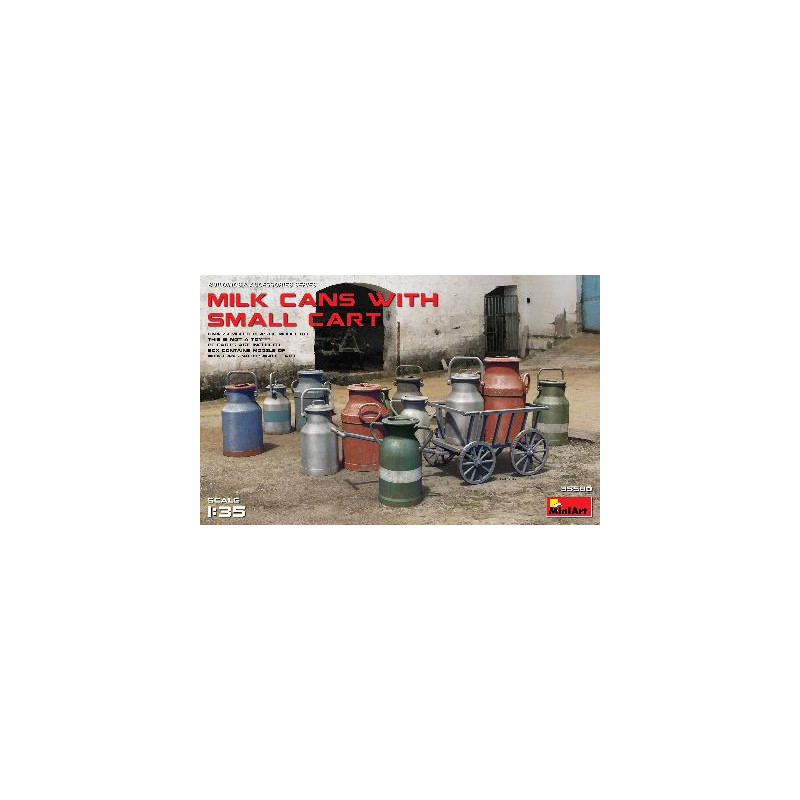 Cette boite maquette militaire Miniart au 1/35 propose des bidons de lait de formes diverses ainsi qu'une petite charrette pour les transporter. Elle permet d'agrémenter vos dioramas, réf : 35580