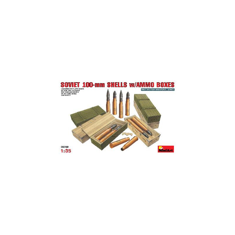 Cette boite maquette militaire Miniart au 1/35 propose des caisses de munitions et de douilles de 100mm soviétiques. Elle permet d'agrémenter vos dioramas, réf : 35088