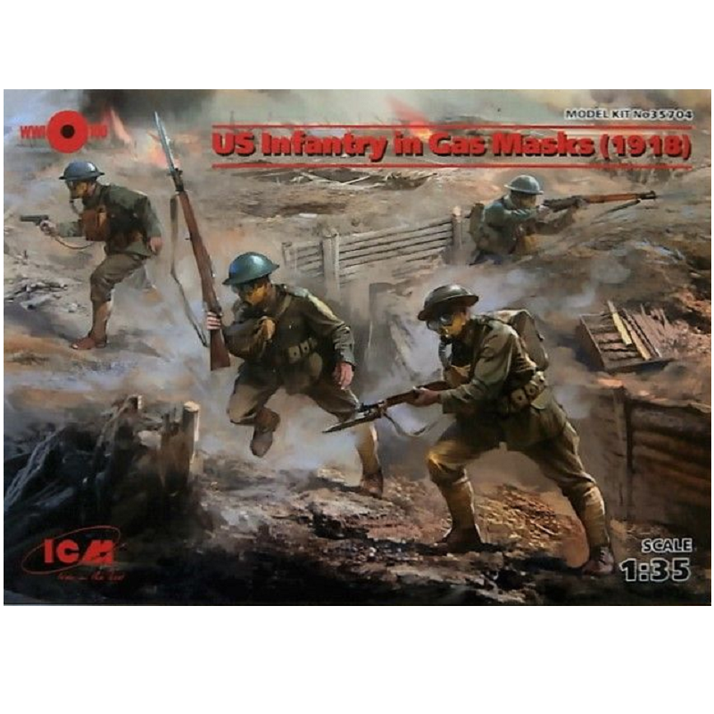 Cette boite maquette militaire ICM au 1/35 propose quatre figurines d'infanterie américaine équipées de masques à gaz lors de la Première Guerre mondiale, réf : 35704