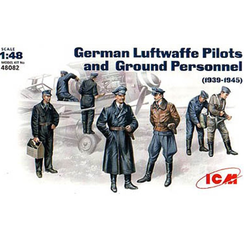 Cette boite maquette militaire ICM au 1/48 propose sept figurines (pilotes et personnel au sol) appartenant au corps de la Luftwaffe au cours de la Deuxième Guerre mondiale, réf : 48082