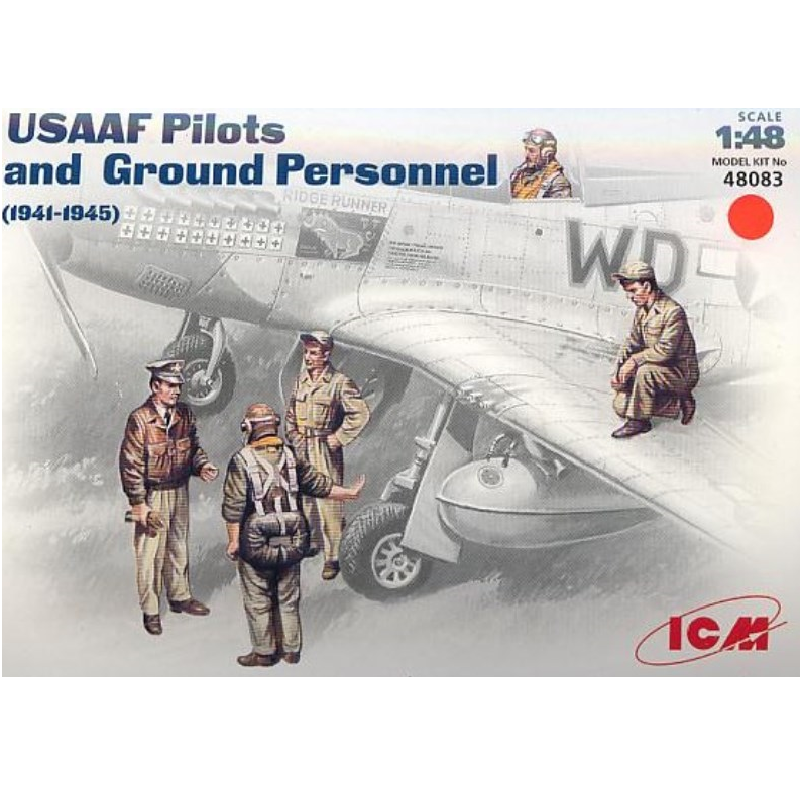 Cette boite maquette militaire ICM au 1/48 propose cinq figurines (pilotes et personnel au sol) appartenant au corps de l'USAAF au cours de la Deuxième Guerre mondiale, réf : 48083