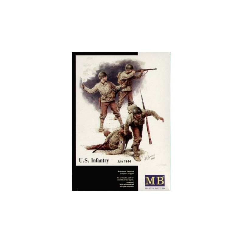 Cette boite maquette militaire MB au 1/35 propose quatre figurines d'infanterie américaine en juillet 1944, réf : 3521