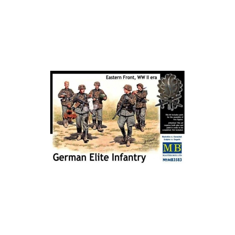 Cette boite maquette militaire MB au 1/35 propose cinq figurines de Waffen SS sur le front de l'Est au cours de la Seconde Guerre mondiale, réf : 3583