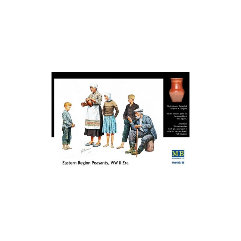 Cette boite maquette militaire MB au 1/35 propose cinq figurines de paysans d'Europe de l'Est (deux adultes et trois enfants) au cours de la Seconde Guerre mondiale, réf : 3588