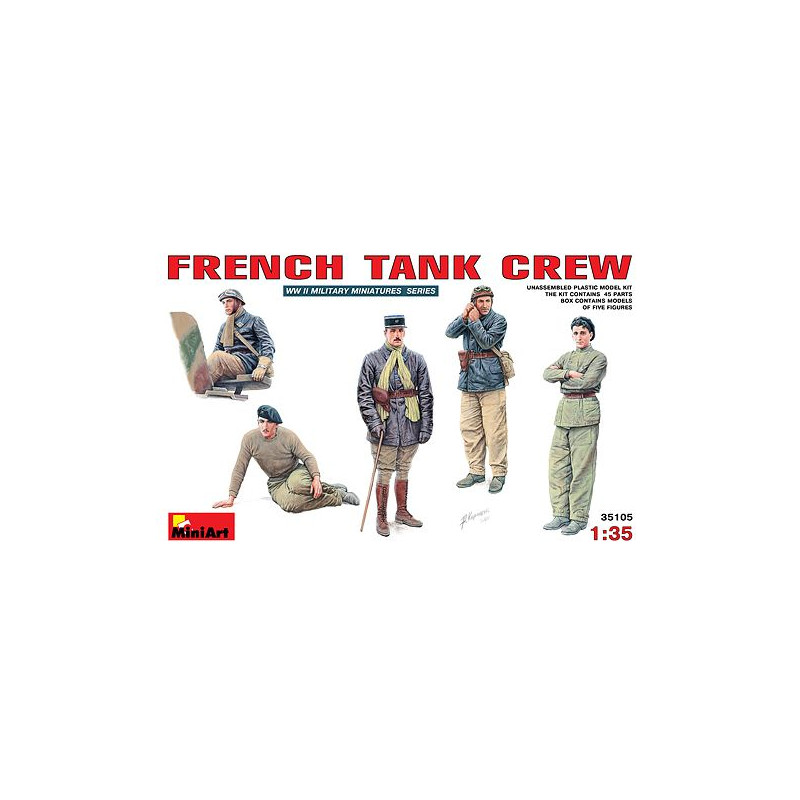 Cette boite maquette militaire Miniart au 1/35 propose cinq figurines de soldats représentant un équipage de char français au cours de la Seconde Guerre Mondiale, réf : 35105