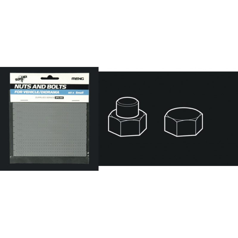 Ce set Meng au 1/35 propose deux types de boulons et écrous fournis dans trois dimensions différentes. Ils peuvent être utilisés pour des kits de véhicules militaires de tous types et de toutes périodes et également dans le cadre de dioramas, réf: SPS-005
