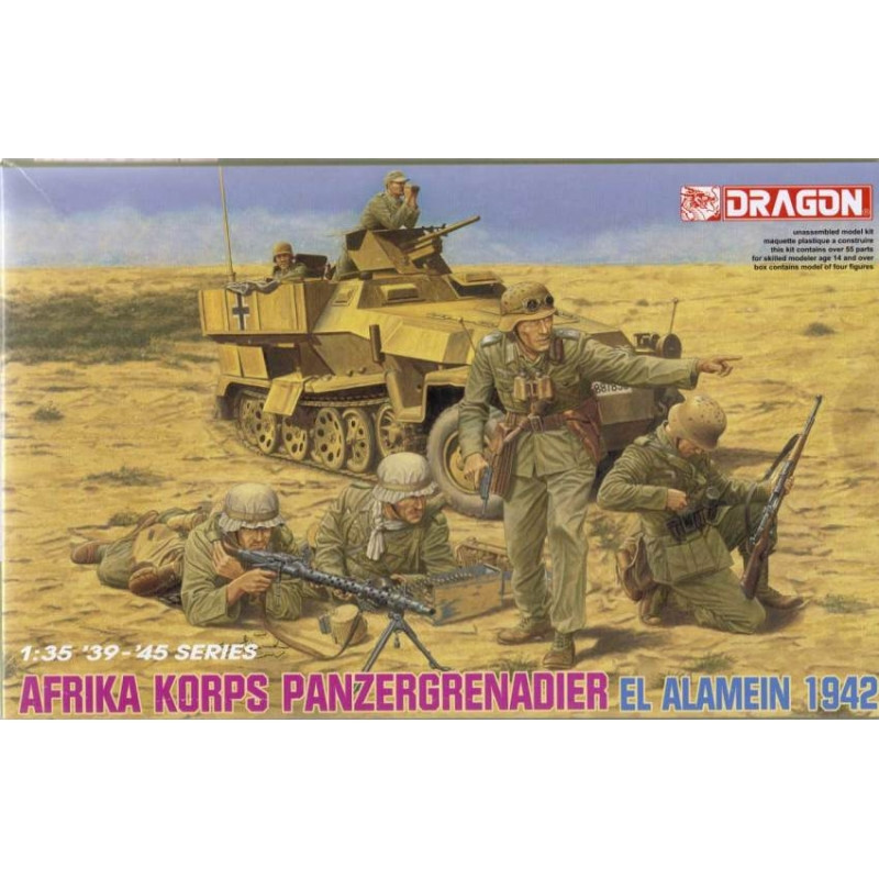 Cette boite Dragon au 1/35 contient 4 figurines de Panzergrenadiers de l'Afrika Korps au cours de la Seconde Guerre mondiale ainsi que des armes légères et divers accessoires. Les positions et les tenues de soldats sont adaptées pour agrémenter un diorama se situant à El Alamein en 1942, réf: 6389